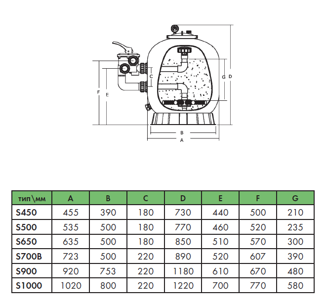 Фильтрационная емкость S500, клапан 1,5" в стороне, 9 м3/час, загрузка песка 85 кгКод: S500
