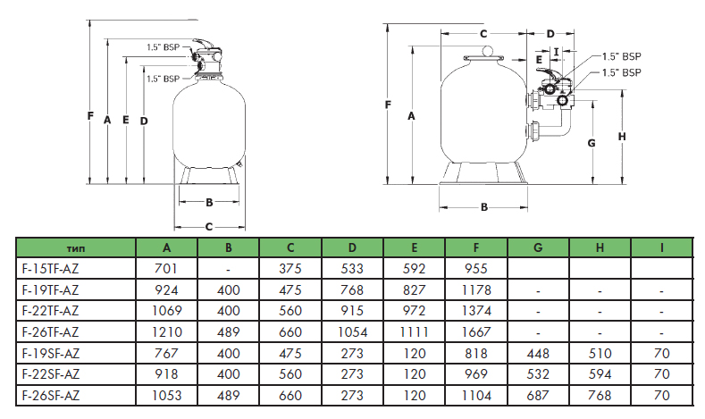 Фильтровальная емкость AZUR 475 мм, 9 м3/ч 6-ходовой боковой клапан, 80 кг пескаКод: F-19SF-AZ