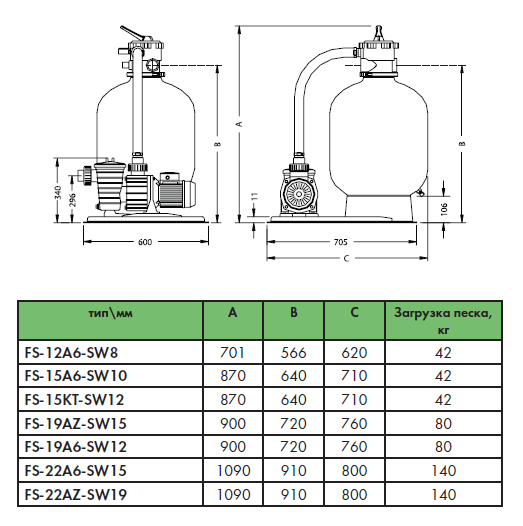 Фильтрационный комплект 300 мм, 5 м3/час с насосом SW-8M, 0,18 кВтКод: FS-12A6-SW8