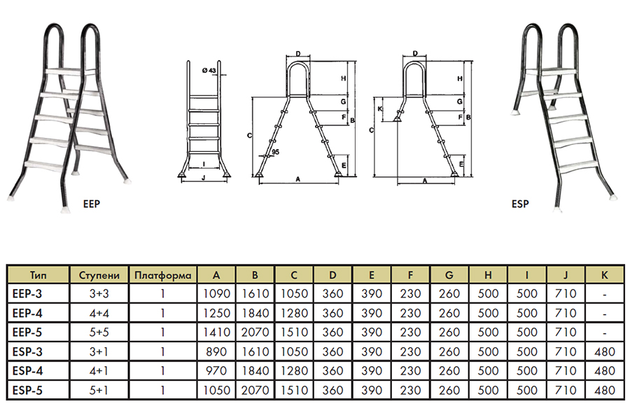 Лестницы предназначены для частных и коммерческих бассейнов, они изготовлены из полированной нержавеющей стали диаметром в 43 мм. Анкерование поставляется с втулкой и зажимом для соединения.