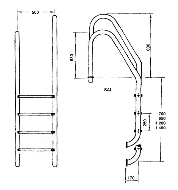 Лестницы предназначены для частных и коммерческих бассейнов, они изготовлены из полированной нержавеющей стали диаметром в 43 мм. Анкерование поставляется с втулкой и зажимом для соединения.