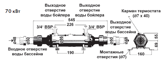 Теплообменники для бассейнов компании Bowman изготавливаются с коррозиоустойчивыми медно-никилевыми трубами и бронзовыми торцевыми крышками, в следствие чего подходят для использования в хлорированной воде, морской воде или в терапевтических и spa-бассейнах. Продукция легка в обслуживании, т.к. и торцевая крышка, и трубные пучки могут быть просто демонтированы для чистки, это является уникальным свойством разработок Bowman.