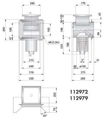 сливного отверстия и крышкой. Подключение: внутренняя резьба 2”. Скиммер с короткой горловиной для бассейнов из бетона. На входе снабжён фланцем для крепления к стене